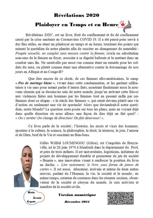 C’est un plaidoyer en temps et en heure, un livre de 84 pages et repartit en deux volets. Première partie : Révélations sur les sujets liés à la non-considération de la femme, sa dignité personnelle, de l’avenir de la dot-mariage et aux soldats du sexe face à l’offre Poupée sexuelle et la deuxième partie: Révélations sur les sujets d'aide à l'émancipation de la femme et à la prise de conscience sur sa destinée.
